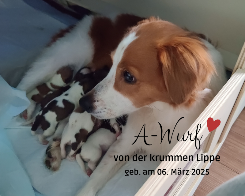 Der A-Wurf mit vier Rüden und drei Hündinnen (insgesamt sieben Welpen) wurde am 06. März 2025 (Tag 64 der Trächtigkeit) geboren. Mama Baylie und den Welpen geht es zum aktuellem Zeitpunkt gut.