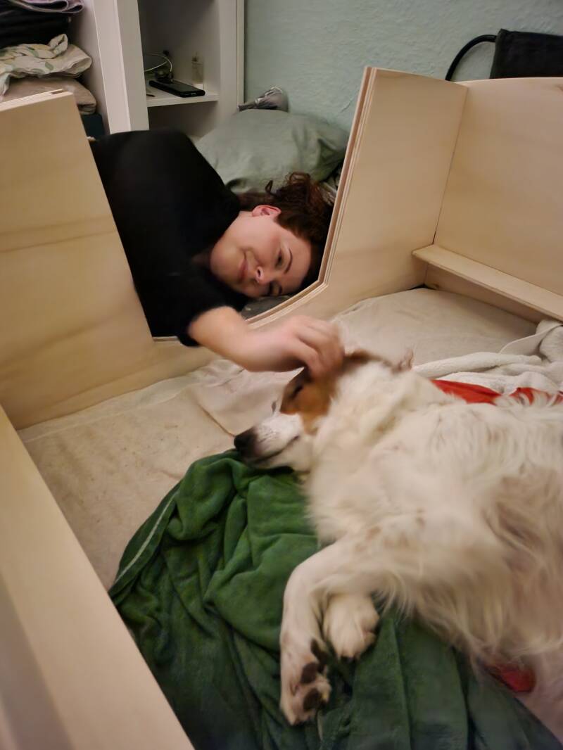 Tatsächlich war es uns sogar möglich, zum Ende hin die Wehen deutlich mit dem bloßen Auge zu erkennen. Wellenförmig zogen sich die Wehen von der Mitte von Baylies Bauch nach hinten. Dort angekommen reagierten Baylies Becken und ihre Hinterbeine mit Zittern und sie jaulte auf. Zu diesem Zeitpunkt hatten wir den Eindruck, dass es Baylie wichtig war, dass wir an ihrer Seite sind. Von ihrer Liegeposition her hat sie sich mit dem Oberkörper zu Tahnee orientiert und ihren Kopf bei jeder Wehe in den Armen von Tahnee vergraben. Zudem hatten wir das Gefühl, dass es ihr half, wenn wir ihr gut zureden.