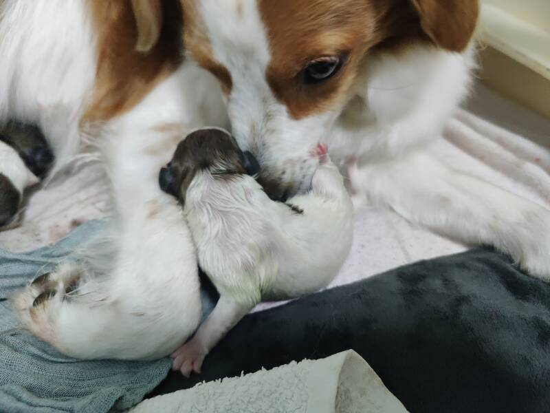 Die Fruchthüllen mussten wir lediglich bei zwei Welpen öffnen. Dies gelingt am besten, indem man die Fruchtblase unterhalb des Kopfes des Welpen öffnet und über den Kopf hinweg zieht. Das Öffnen der Fruchtblase ist besonders wichtig, wenn die Plazenta nicht mehr mit dem Kreislauf der Mutter verbunden ist. Ab diesem Moment bricht die Sauerstoffzufuhr ab und der Welpe bekommt keine Luft mehr oder atmet Fruchtwasser ein. Bei den meisten Welpen ist die Amnionblase aber während der Geburt aufgegangen, sodass kein Handlungsbedarf bestand.
