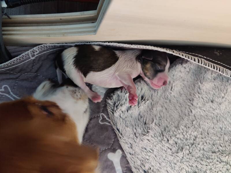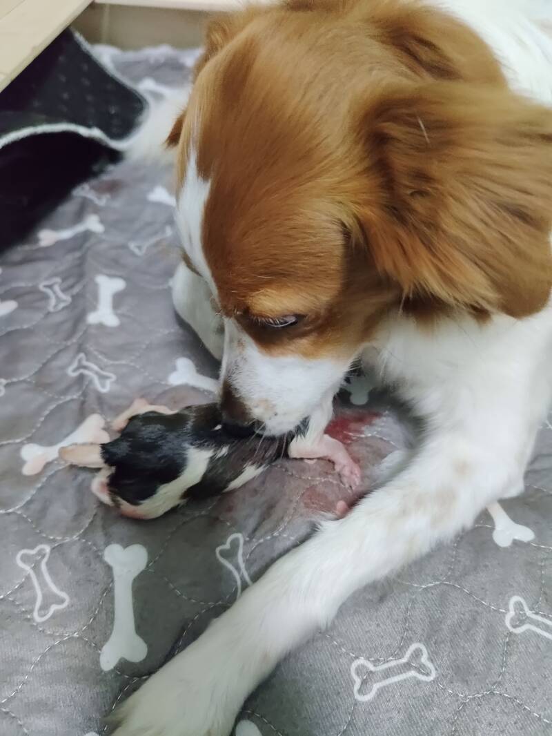 19:13 Uhr erblickte der zweite Welpe (Hündin 1) ebenfalls in Vorderendlage die Welt. Anschließend folgte Welpe 3 (Rüde 2) in Hinterendlage.