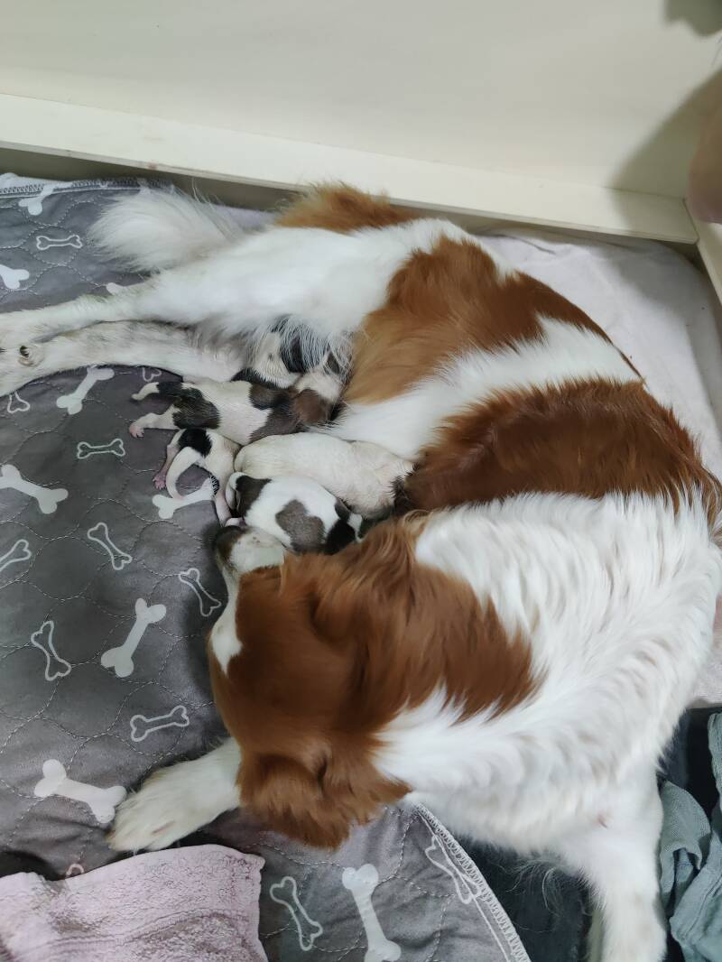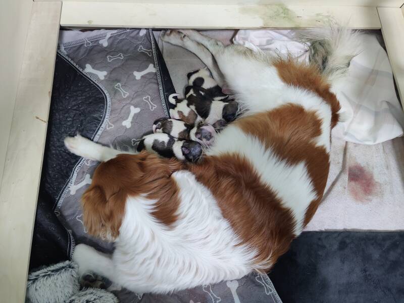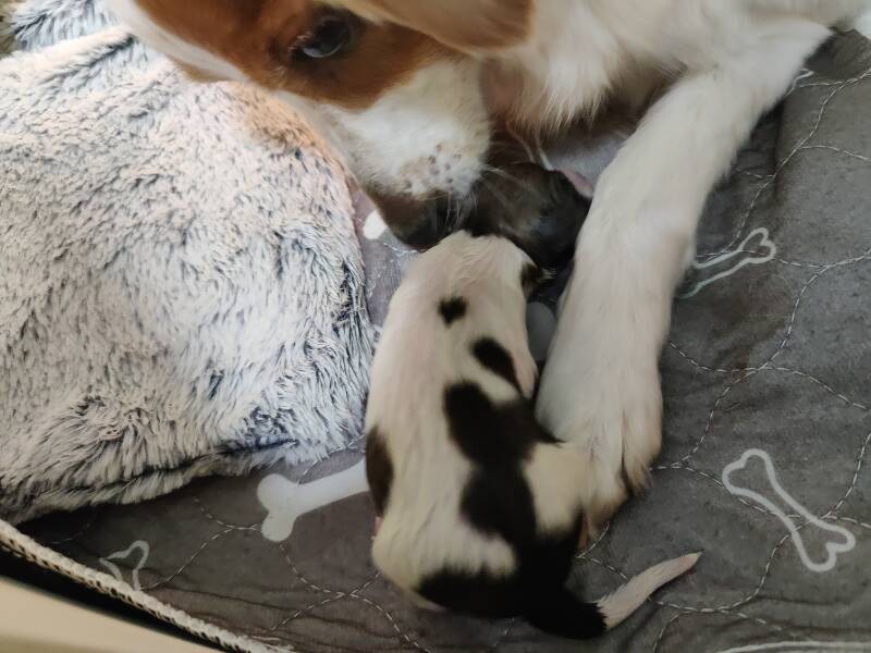 Nach der Geburt durfte Baylie sich ausruhen und sich auf ihre Welpen konzentrieren, und das hat sie von Minute 1 an sehr liebevoll und hingebungsvoll getan. Also hat sie die Welpen gut angenommen.