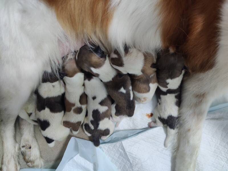 Die ersten 5 Welpen hat Baylie für eine Erstgebärende in moderaten Abständen ausgetrieben. Erst nach dem 5. Welpen hat sie sich bei den letzten Welpen jeweils eine längere Pause gegönnt – das ist absolut normal und in Ordnung. Was uns während der Geburt trotz Vorbereitung jedoch sehr überrumpelt hat, war, dass Baylie erst mit der Geburt des 5. Welpen einen richtigen Milcheinschuss hatte. Das hat uns nervös gemacht, sodass wir uns neben 5 quiekenden Welpen schnell um Ersatzmilch kümmern mussten, was sportlich und stressig war – und das eigentlich umsonst, denn parallel zu unseren kläglichen Versuchen, einzelne Welpen mit der Kolostrum-Ersatzmilch zu füttern, setzte die Milchproduktion von Baylie ein. Die Milch hat dann Baylie als Energieshake bekommen (haha).