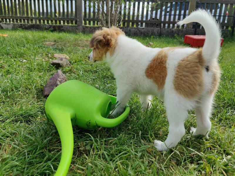 Der Garten selbst ist sehr groß, gesichert und bietet viel Platz und tolle Möglichkeiten um sich auszuprobieren und das ein oder andere zu erkunden. Da wir in einem ehemaligen Bauernhaus leben und die alte Scheune zu einem Pferdehof umfunktioniert wurde, haben die Welpen im Garten automatisch bereits Sichtkontakt zu Pferden.