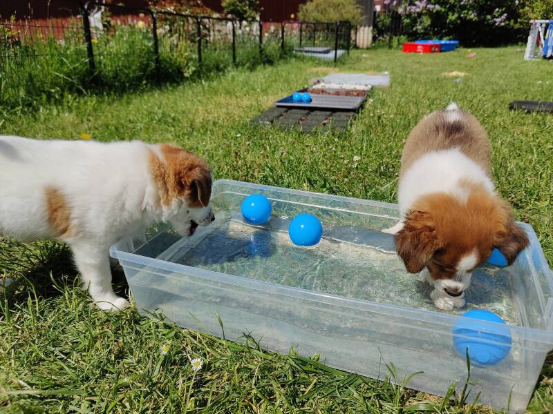 In den ersten Lebenswochen besteht der Lebensinhalt der Welpen aus Milch trinken und schlafen. Die Schlafphasen der Welpen nutzen wir für ein gezieltes Entspannungstraining. Das bedeutet, dass wir die Welpen auf Lavendelduft konditionieren. Sobald es ihnen möglich ist zu hören ergänzen wir das Training mit RelaxoPet (hochfrequente Klangwellen zur Entspannung). Beides konditioniert die Welpen an den Duft bzw. den Klang, was später von den Kromi-Eltern in Spee genutzt werden kann, um dem Welpen zu helfen, schneller in Entspannung zu kommen.