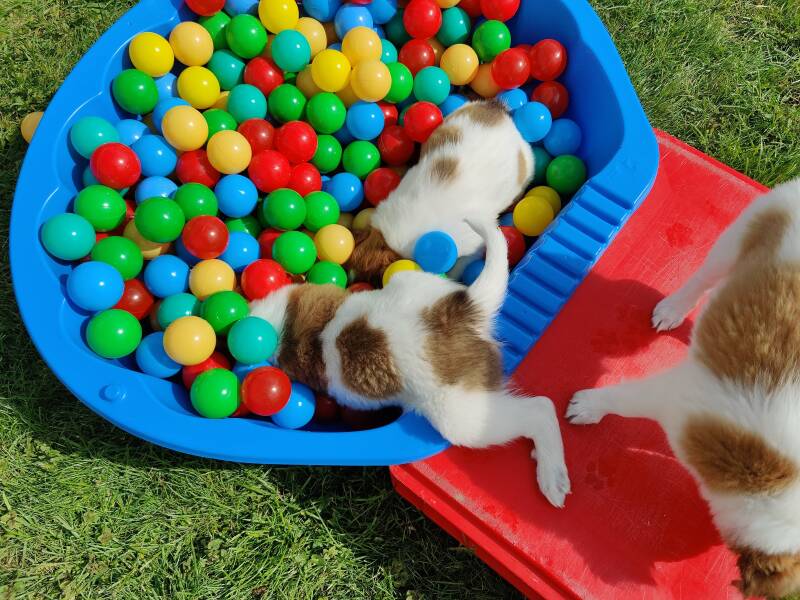 Ab der sechsten/siebten Woche schauen wir, dass die Welpen neben ihrer Mama auch mal andere Hunde zu Gesicht bekommen wie beispielsweise ihren Papa. Generell haben die Welpen aber schon bedingt durch die Lage des Außenauslaufes viel Sichtkontakt zu Mensch, Tier und Autos.