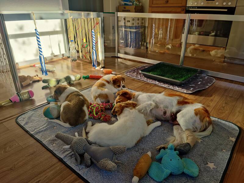 Da sich unsere komplette Wohnfläche im Erdgeschoss befindet, sind Dimitri und ich immer direkt oder einen Raum weiter bei Baylie und ihren Welpen. Generell werden wir alle Zwischentüren auflassen, um erstens alles mitzubekommen und zweitens Baylie die Möglichkeit zu geben, sich bei Bedarf auch mal zurückziehen zu können.